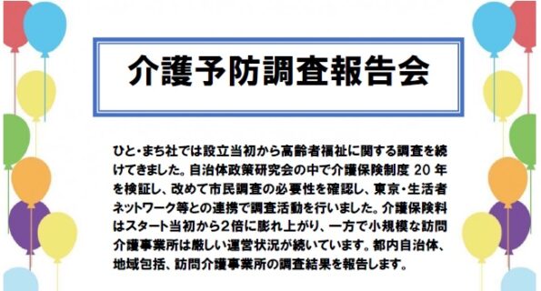 主催:認定NPO市民シンクタンクひと・まち社2025年10月10日(金)14時~16時半(13時半開場) 都庁・議会棟第2会議室 講演:鏡 諭 氏(元淑徳大学コミュニティ政策学部教授)報告:工藤 春代(ひと・まち社代表理事)コーディネーター: 坪郷 實 氏(早稲田大学名誉教授)司会:池田 敦子(ひと・まち社理事)資料代:1000円 ひと・まち社では設立当初から高齢者福祉に関する調査を続けてきました。自治体政策研究会の中で介護保険制度20年を検証し、改めて市民調査の必要性を確認し、東京・生活者ネットワーク等との連携で調査活動を行いました。介護保険料はスタート当初から2倍に膨れ上がり、一方で小規模な訪問介護事業所は厳しい運営状況が続いています。都内自治体、地域包括、訪問介護事業所の調査結果を報告します。