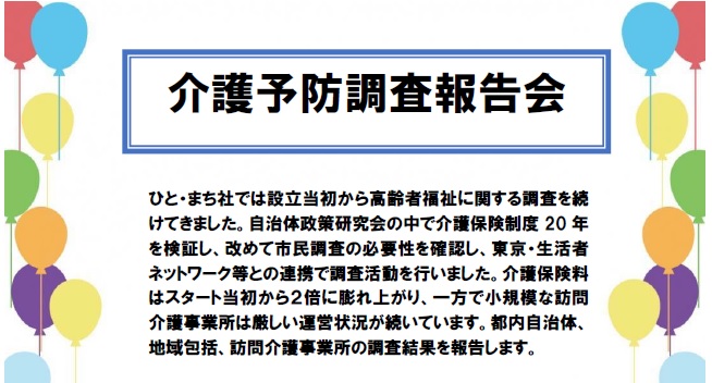 ひと・まち社では設立当初から高齢者福祉に関する調査を続けてきました。自治体政策研究会の中で介護保険制度20年を検証し、改めて市民調査の必要性を確認し、東京・生活者ネットワーク等との連携で調査活動を行いました。介護保険料はスタート当初から2倍に膨れ上がり、一方で小規模な訪問介護事業所は厳しい運営状況が続いています。都内自治体、地域包括、訪問介護事業所の調査結果を報告します。